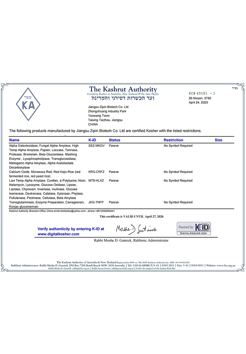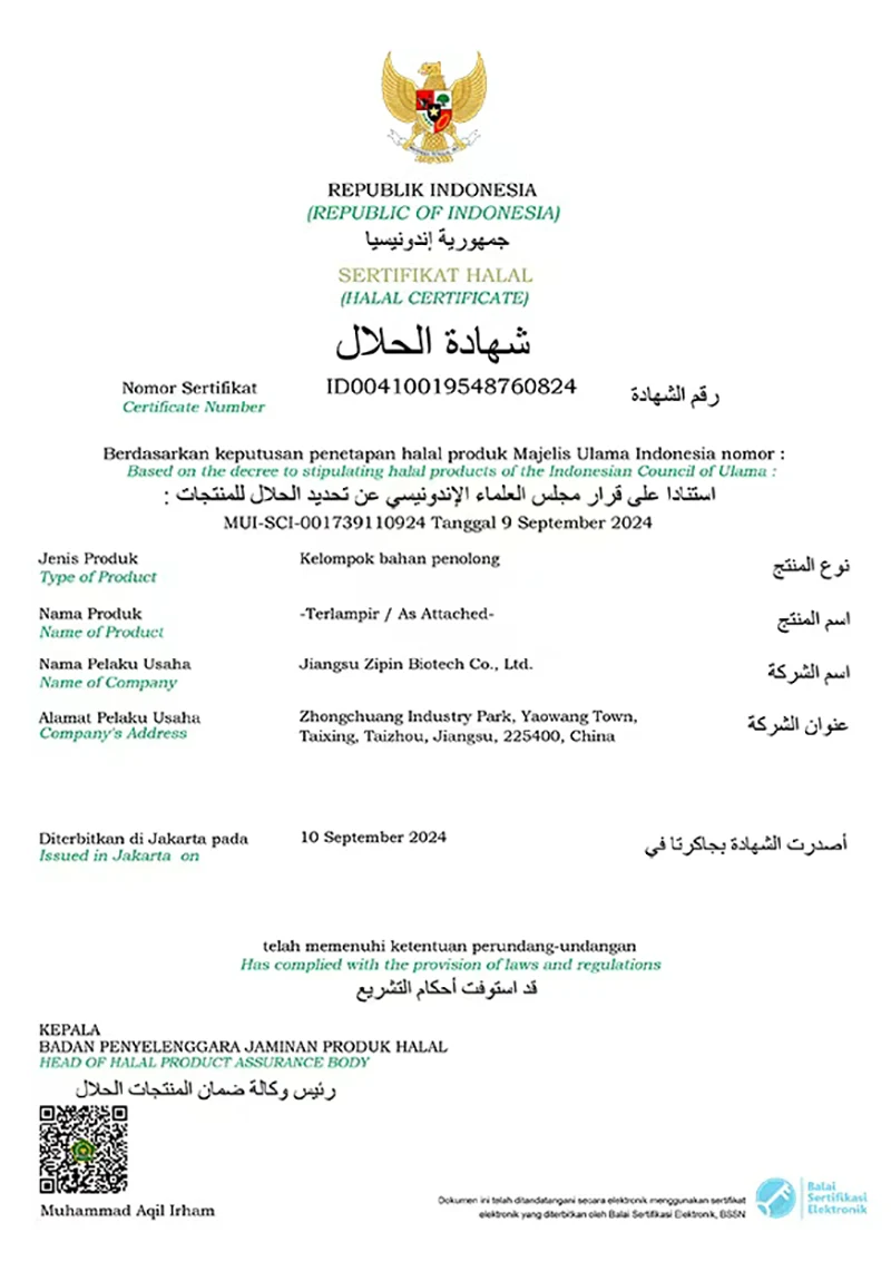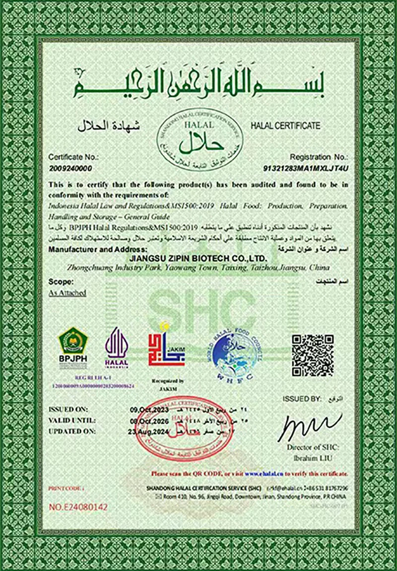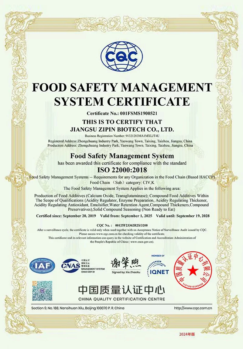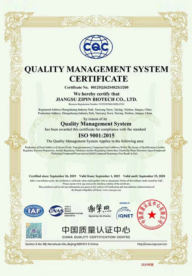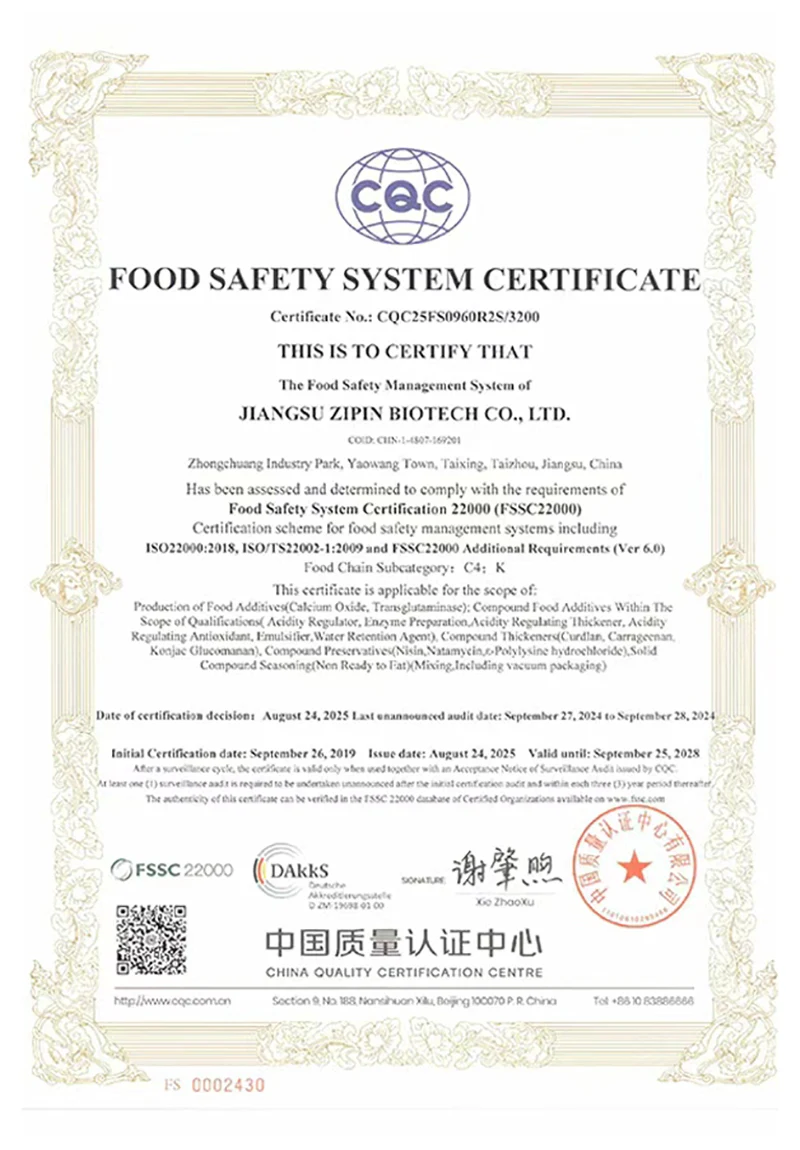 Jiangsu Zipin Biyoteknoloji Co, Ltd. 2016 yılında 20.000㎡'lik bir alanı kaplayarak kuruldu. Modern bir özel kuruluş olarak artık ağırlıklı olarak gıda katkı maddelerinin Ar-Ge, üretim ve satışıyla ilgileniyoruz. Başlıca ürünlerimizTransglutaminaz, Curdlan, ε-polilizin, Nisin, Natamisin ve diğer gıda katkı maddeleri.